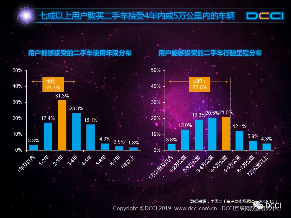 此外,七成以上用户购买二手车接受4年内或5万公里内的车辆。75.3%的用户能够接受使用年限在4年以内的二手车,77.6%的用户能够接受行驶里程不超过5万公里的二手车,因而,从购买意愿来看,用户偏好较新的车辆。