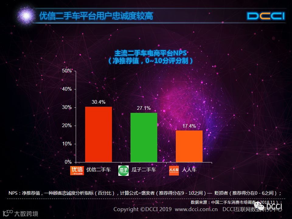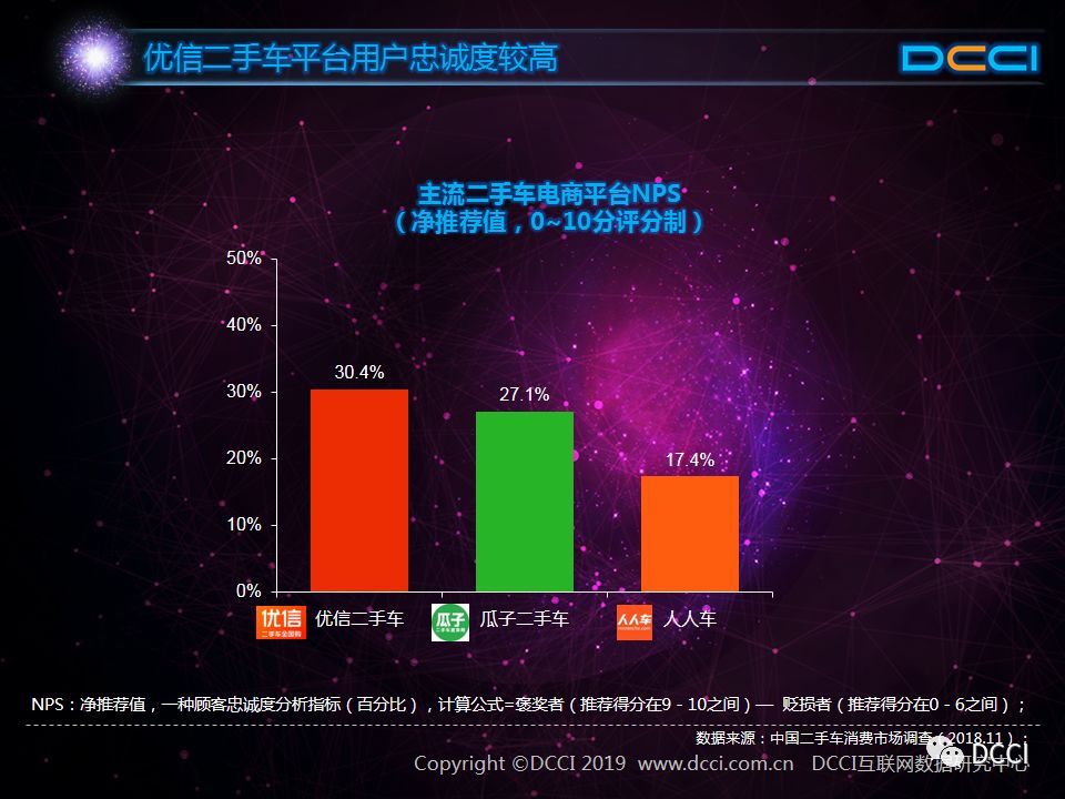 在用户忠诚度方面,优信二手车、瓜子二手车和人人车的净推荐值分别为30.4%、27.1%和17.4%。(备注:净推荐值,顾客忠诚度分析指标,计算公式=褒奖者用户占比减去贬损者用户占比)