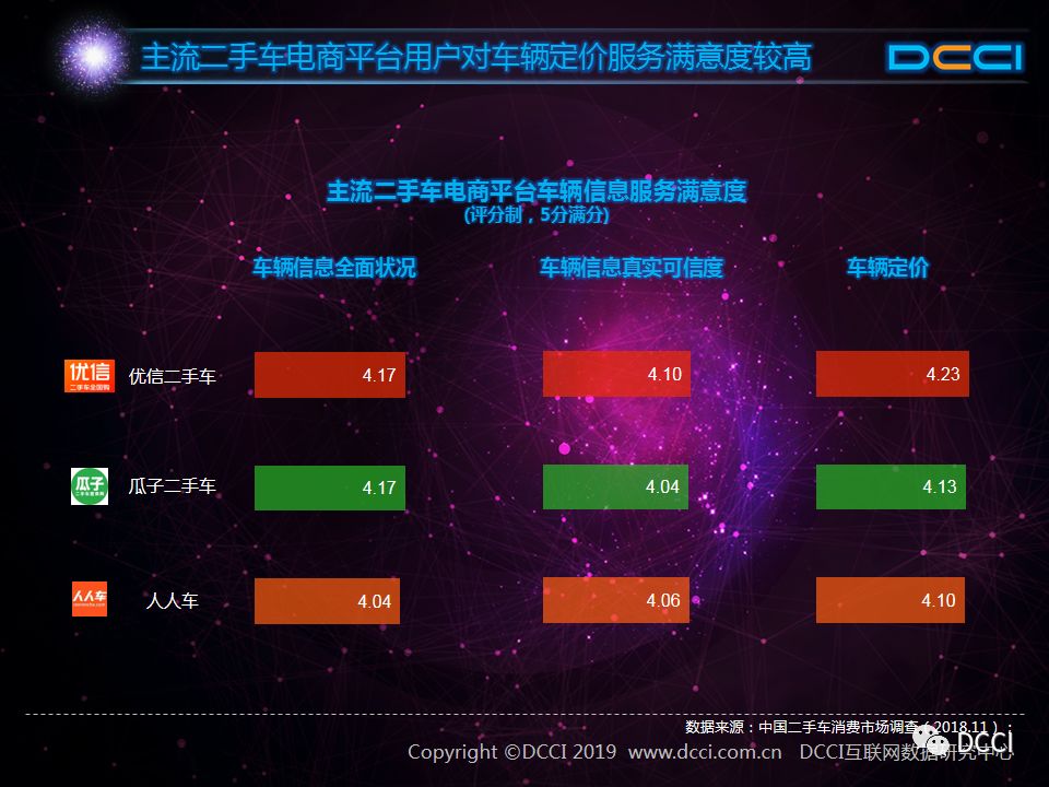现阶段,主流二手车电商平台用户使用满意度较高。在车辆信息服务中,优信二手车和人人车的用户对车辆定价服务满意度最高,瓜子二手车用户对车辆信息全面状况满意度最高。