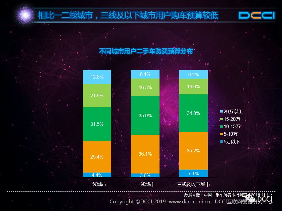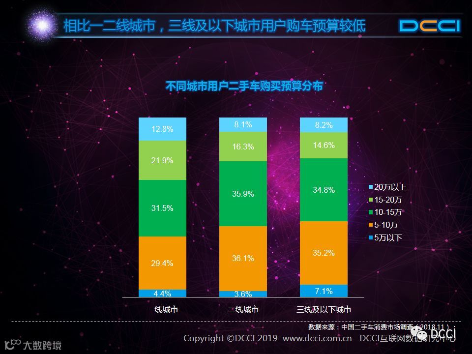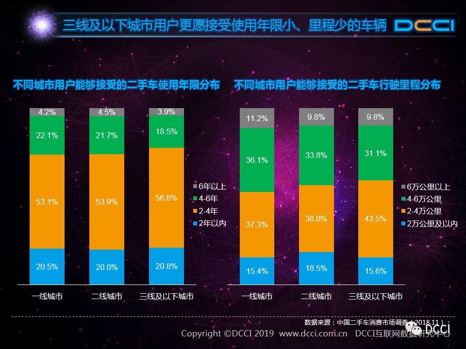 三线及以下城市用户更愿接受使用年限小、里程少的车辆。数据显示,在二手车使用年限和行驶里程方面,一线城市和二线城市用户需求差异化较小,而在三线及以下城市用户中,能够接受使用年限2-4年及行驶里程2-4万公里的用户占比较高。