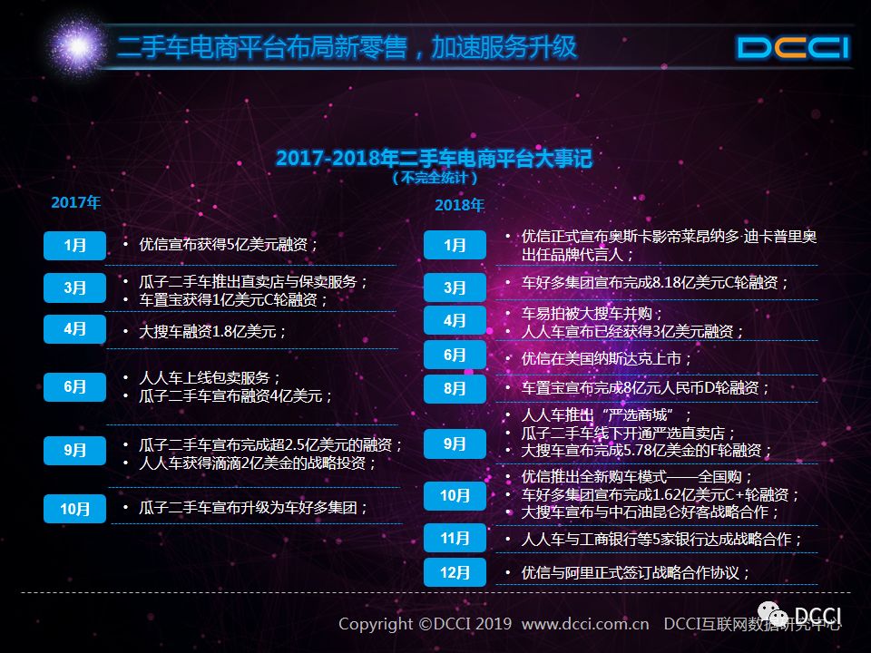 2017年二手车电商平台投融资事件频繁发生,2018年以车易拍为代表的企业开始整合运作,投融资等资本运作同样十分活跃,同时优信、人人车等二手车电商平台聚焦打造二手车交易品质服务,并通过与相关企业合作拓宽渠道,布局新零售。