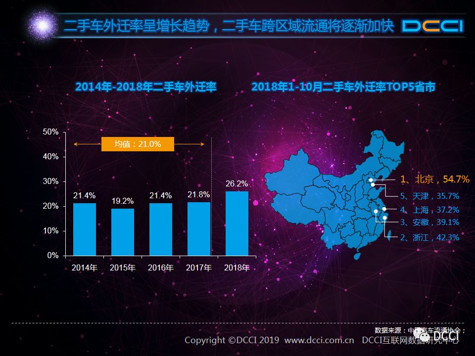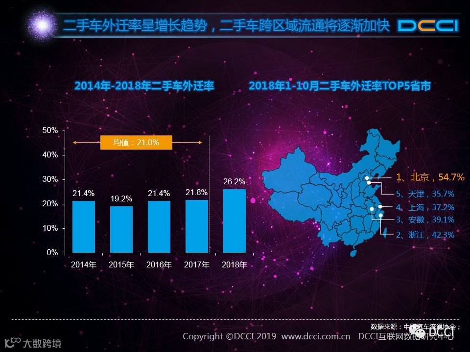 随着限迁政策解除,二手车加快跨区域流通。数据显示,2014年至2017年我国二手车外迁率均值为21.0%,2018年的外迁率为近五年来最高,增长至26.2%。从不同省市的二手车外迁率来看,外迁率较高的均为经济发达地区,如华东、华北地区。其中,2018年1-10月,北京市二手车外迁率高达54.7%,即在北京二手车市场已经有超过一半的二手车在过去进行跨区域交易。