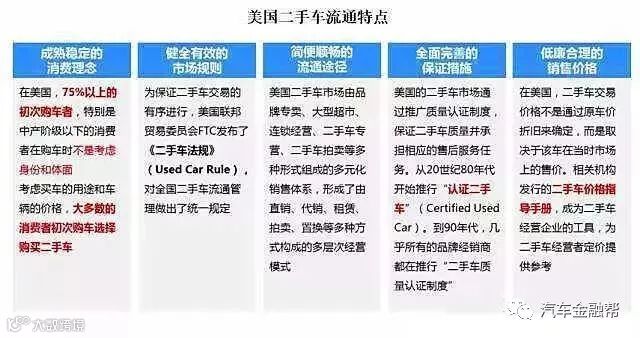 美国建立了一套比较完善的二手车评估、认证、置换、拍卖、收购、销售体制。到90年代美国二手车市场销售额已经达到500亿美金。