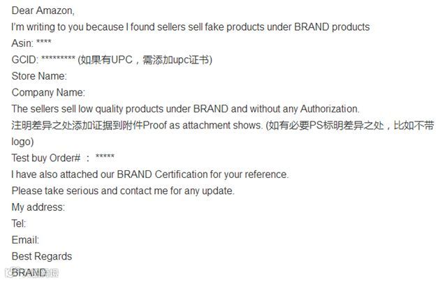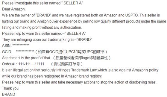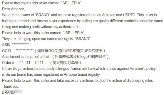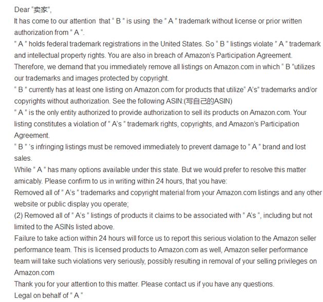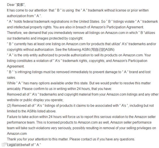 亚马逊跟卖警告信投诉模板: