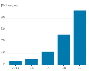 自2013年以来,来自中国的商标申请增长了12倍以上。在2017年财年,中国申请量比加拿大,德国和英国的合并申请数量还多了数倍。根据美国机构审查的每九个商标申请中,约有一个是中国的。