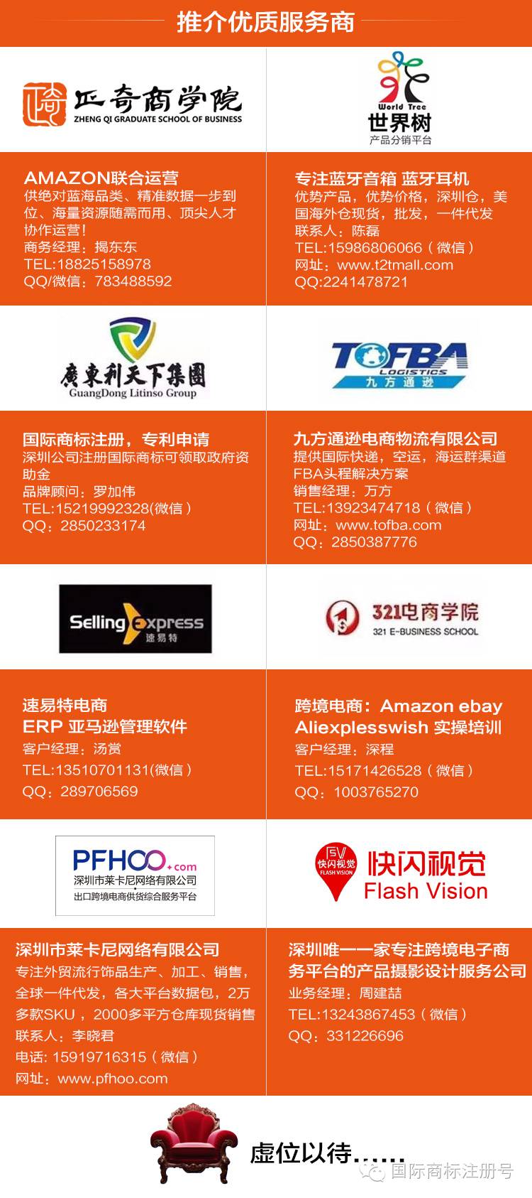 我会告诉您利天下集团的品牌注册做的不错,321的培训效果不错,正奇商学院的神选品和对您店铺运营的二次提升能力会让您受益匪浅,速易特的ERP让你做起事情来事半功倍,九方的物流时效快价格便宜,莱卡尼的首饰物美价廉,快闪视觉做的图片精美绝伦,让你在轻轻松松中实现供应链的最优化,从而实现自己制定的小目标,每个月挣他0.001个亿的美金。