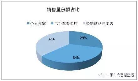 而整个美国二手车市场主要经营主体分为三种渠道:授权汽车经销商4S店、二手车专卖店店、以及个人交易。其中以汽车经销商4S店为主,占市场份额 37%,二手车连锁店份额为 34%,剩下得则是个人及其他交易。如图所示: