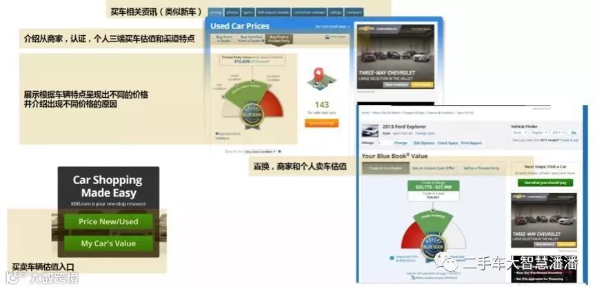凭借KBB模型,KBB能够为二手车分出等级,划定价格区间。另外,KBB只对二手车技术状况查定做一些粗略的概要说明,并没有给出任何二手车价值估算的具体标准和方法,个人消费者和二手车经销商要想了解车辆的任何价格信息,只需浏览KBB网站,按照提示,输入需求的信息,即可查询。
