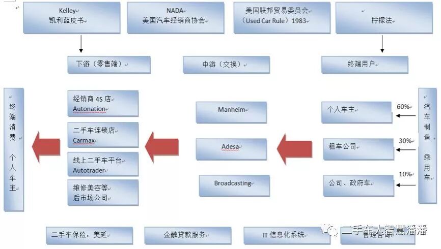 随之而后的发展,美国推行了车辆认证和建立车辆历史档案的质量保障体系,促进保障二手车交易手续简便化。发展至今,美国已经具有比较完善的二手车链条(如下简图1),上游有批量车源(Hertz),中间有拍卖公司(Manheim),下游有完善的不同模式零售商(Autonation/Carmax/Beepi),围绕链条有报价的蓝皮书(Kelley Blue Book),有延保公司(美延),有金融公司(Dealertrack)等。
