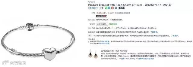 丹麦珠宝品牌潘多拉珠宝因打造妩媚亘永的优质珠宝风靡全球,是全球销售量第三的珠宝品牌。潘多拉珠宝以美丽的方式捕捉生命中的难忘时刻,打造出美轮美奂、工艺精湛的珠宝,从而获得了世界各地消费者的青睐。潘多拉Bracelet with Heart Charm of 17cm 手镯造型别致,非常适合年轻女性佩戴。亚马逊黑五期间售价463元(不含运费及进口税费),亚马逊Prime会员节省运费82元。