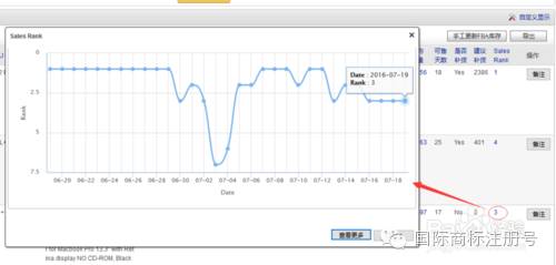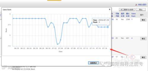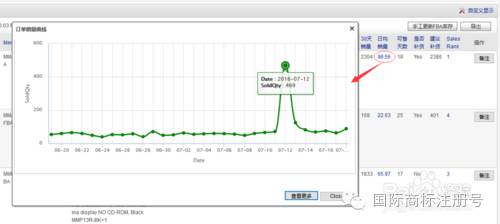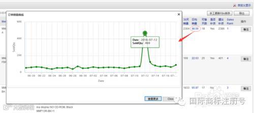 点开日均销量、Sales Rank将显示曲线图表:SKU销量曲线和Sales Rank曲线图