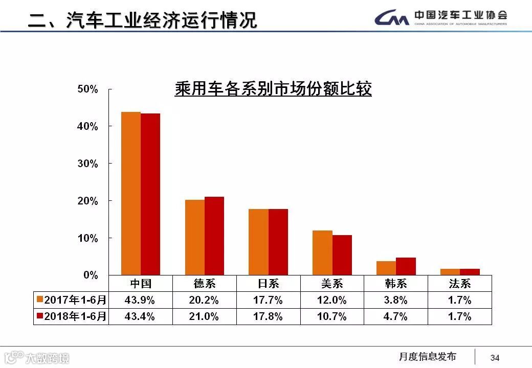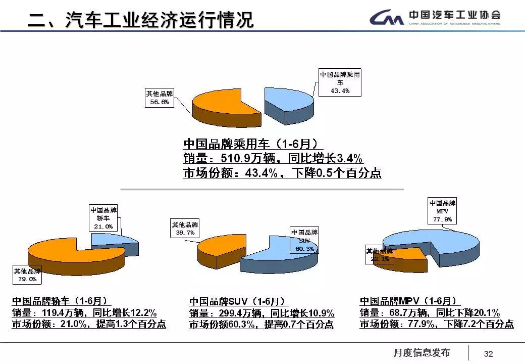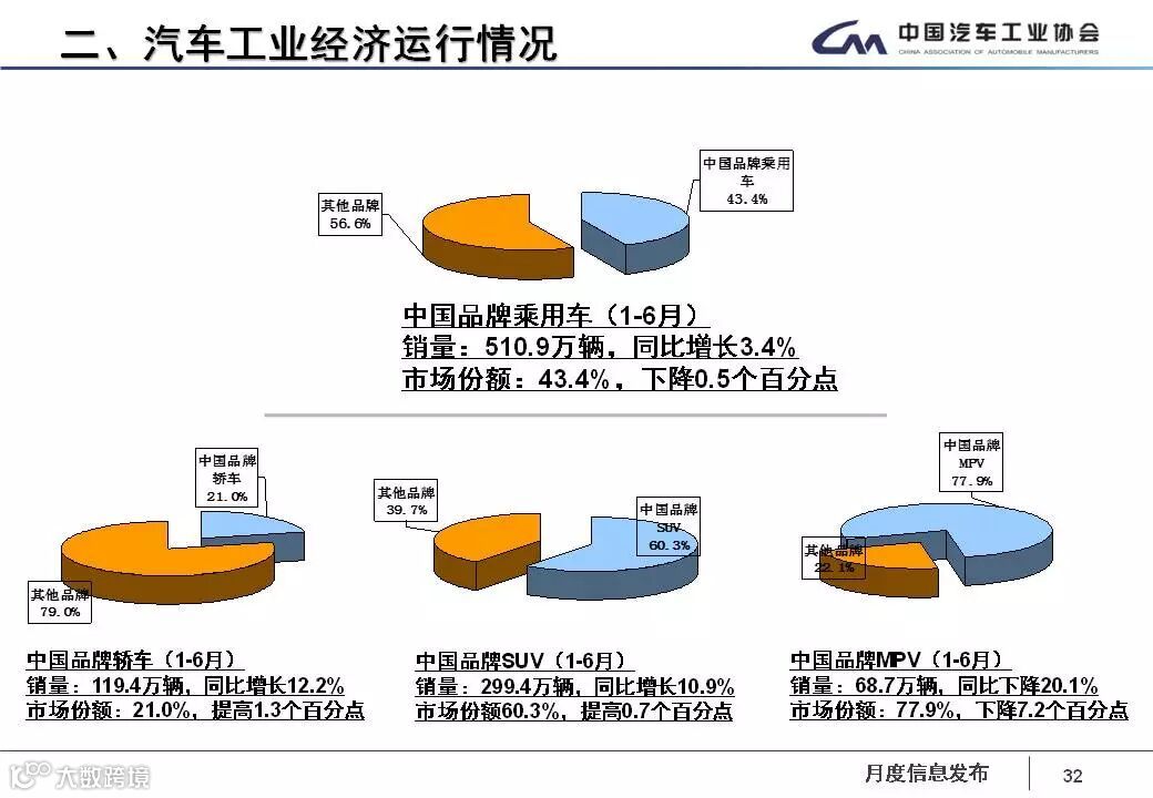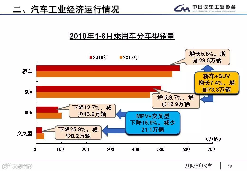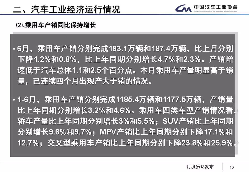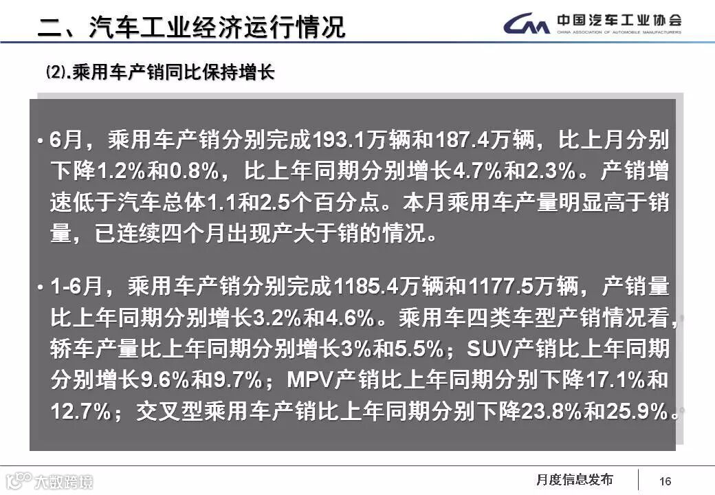 ➁ 乘用车:6月销量187.42万辆,增长2.31%;1-6月销量1177.53万辆,增长4.64%