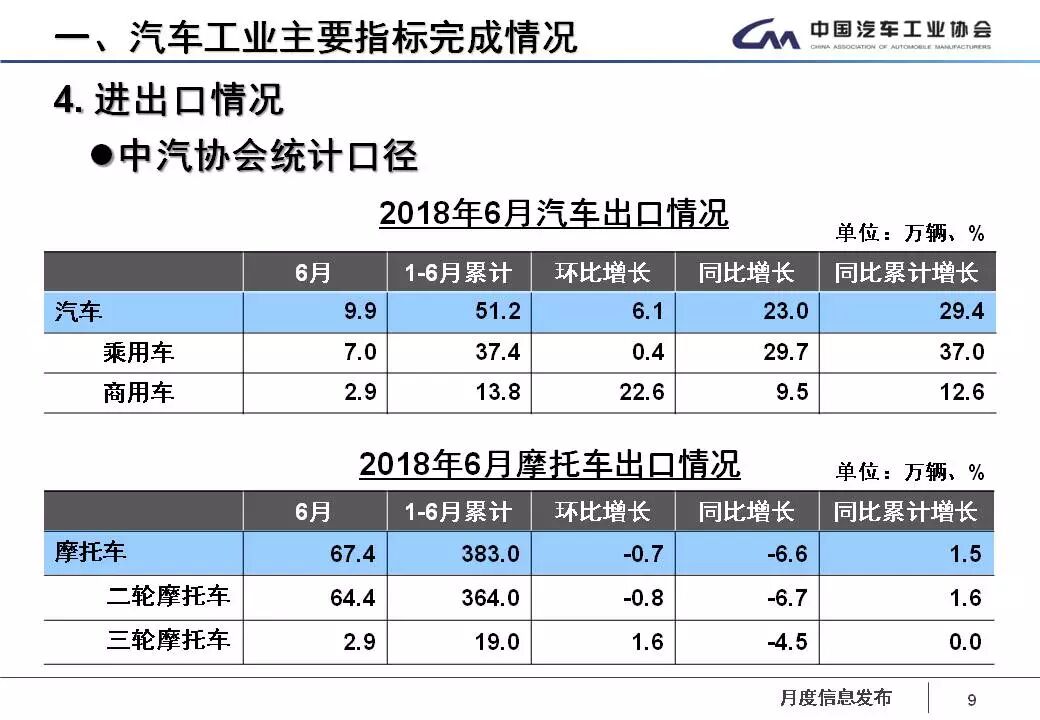 ➅ 汽车出口:6月出口量9.9万辆,增长23.0%;1-6月出口量51.2万辆,增长29.4%