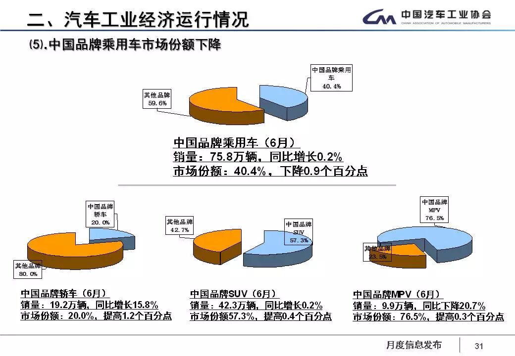➄ 中国品牌乘用车:6月销量75.8万辆,增长0.2%;1-6月销量510.9万辆,增长3.4%