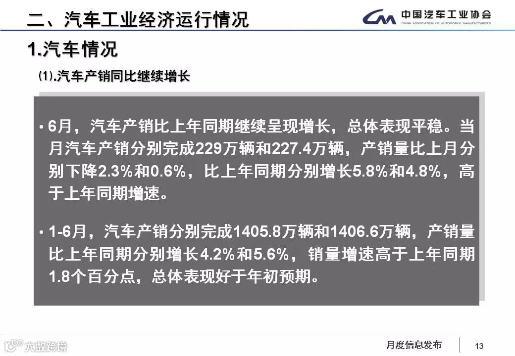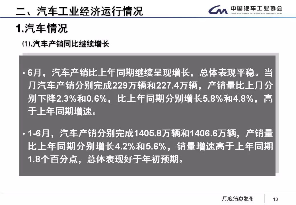 ➀ 汽车整体:6月销量227.37万辆,增长4.79%;1-6月销量1406.65万辆,增长5.57%