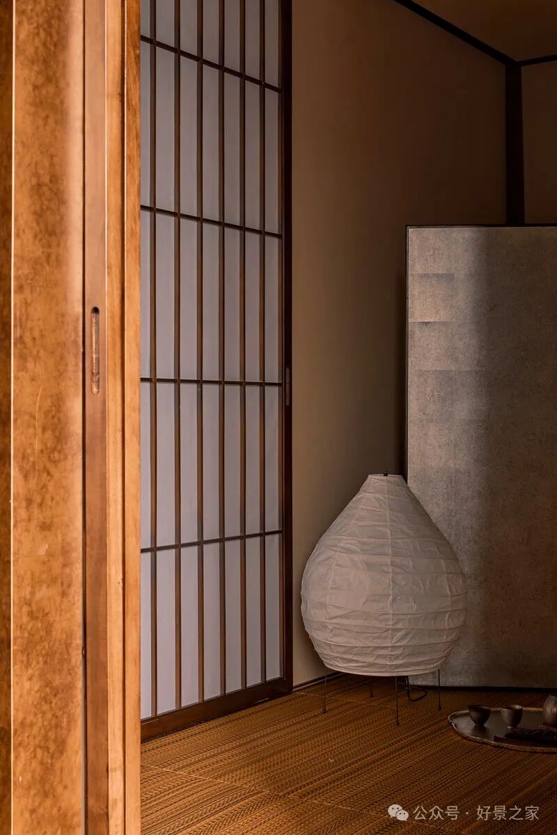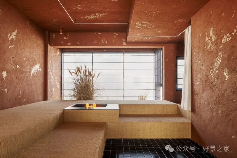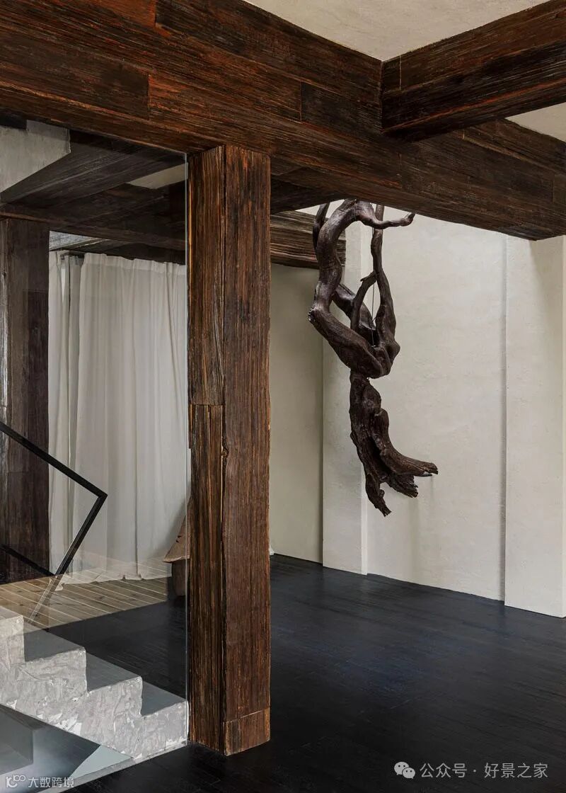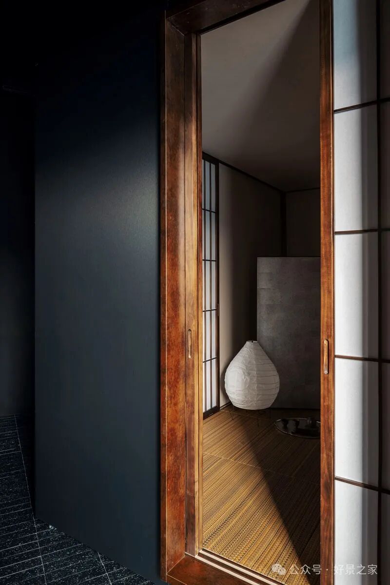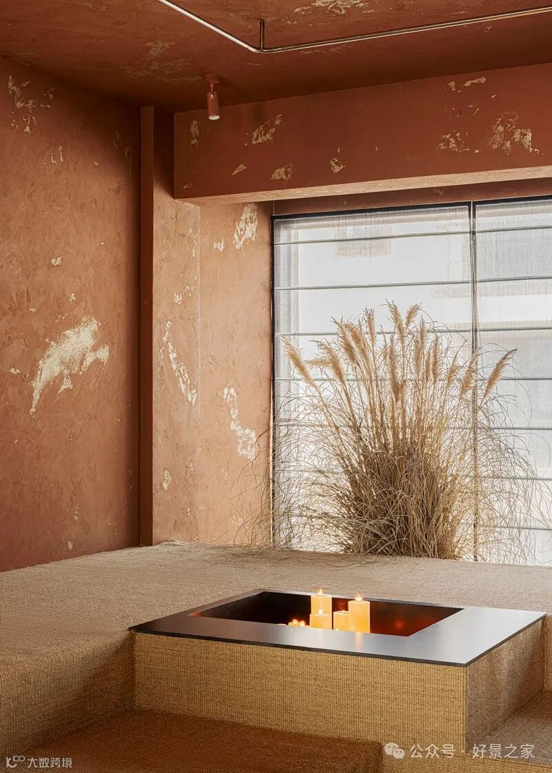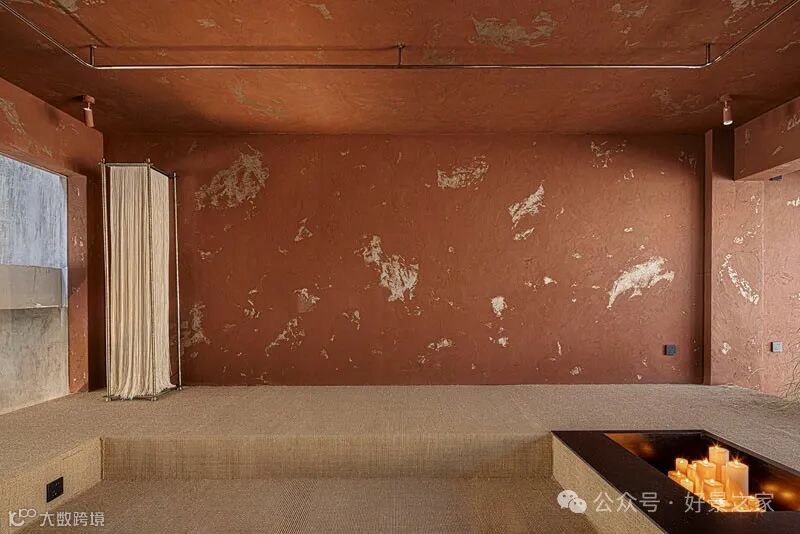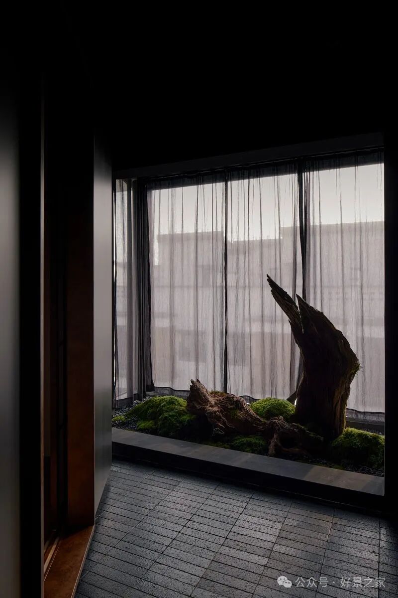 粗砺陶土墙、枯山水庭院、光影斑驳的极简暗黑和室,裸露的墙壁、穿透光影的纱帘、陈旧的手工砖,大胆将野生感的枯树装置贯穿两层垂钓在空间中心,每一帧都是电影级画面。
