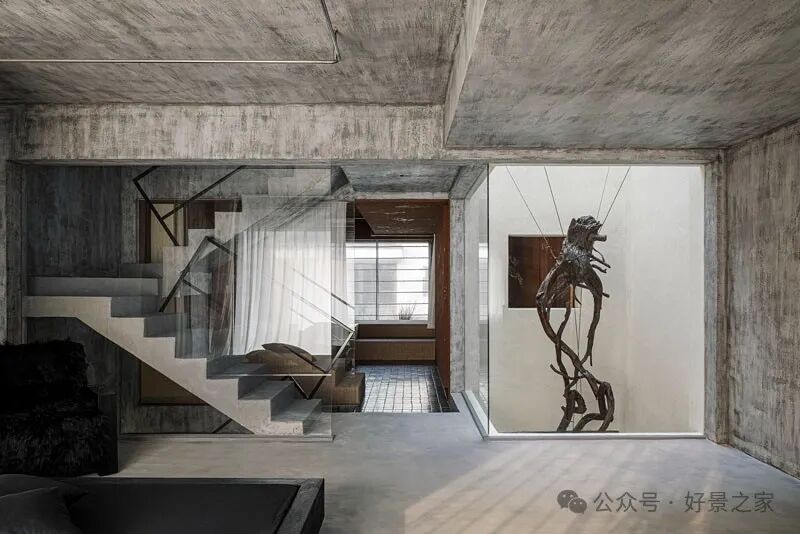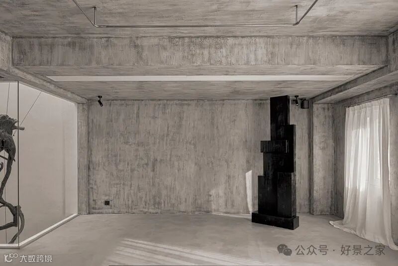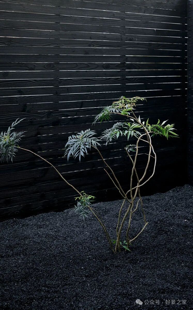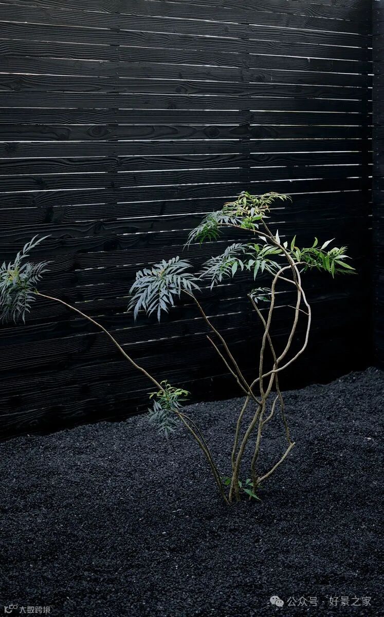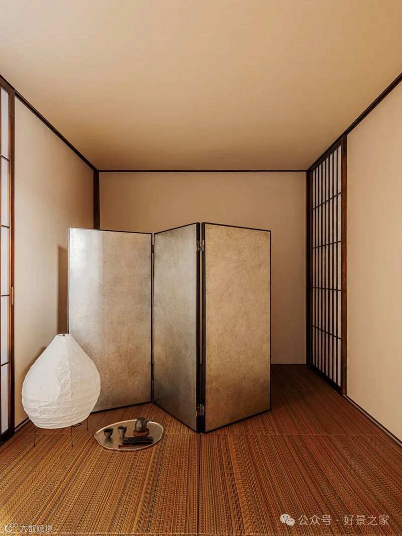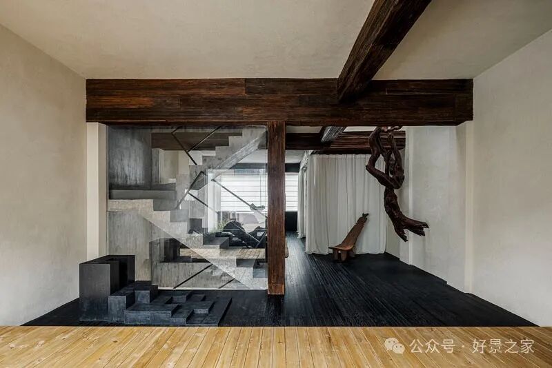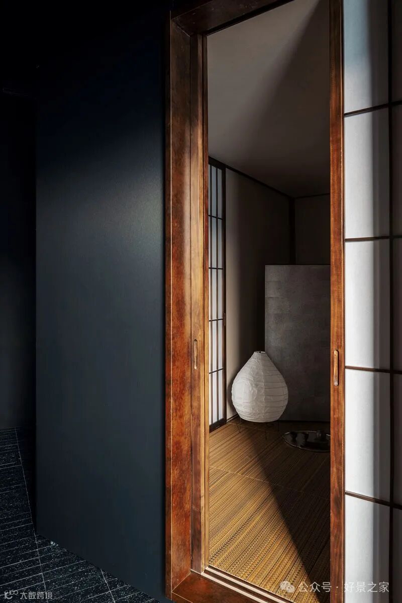 粗砺陶土墙、枯山水庭院、光影斑驳的极简暗黑和室,裸露的墙壁、穿透光影的纱帘、陈旧的手工砖,大胆将野生感的枯树装置贯穿两层垂钓在空间中心,每一帧都是电影级画面。