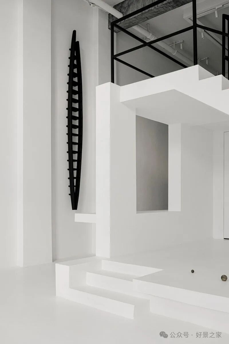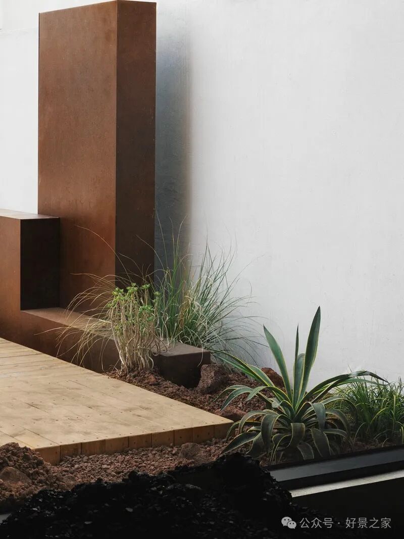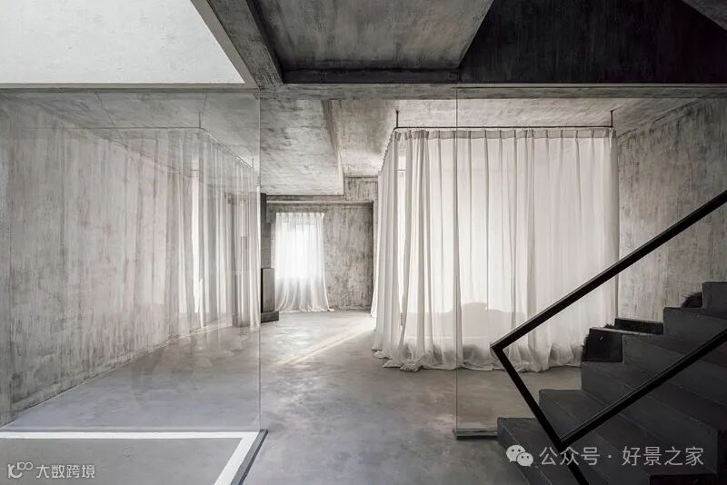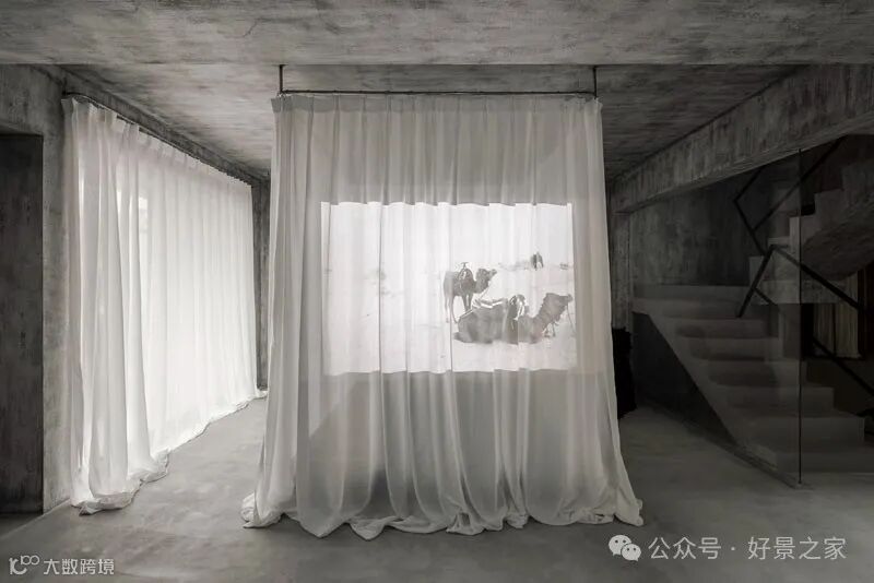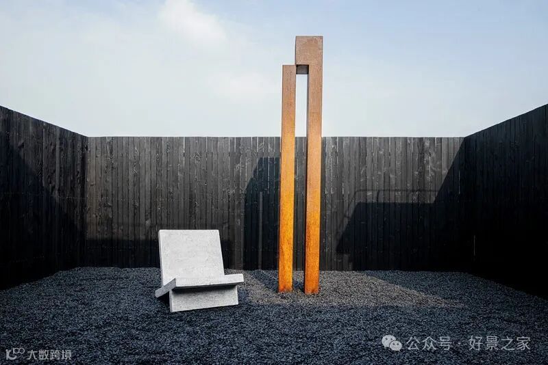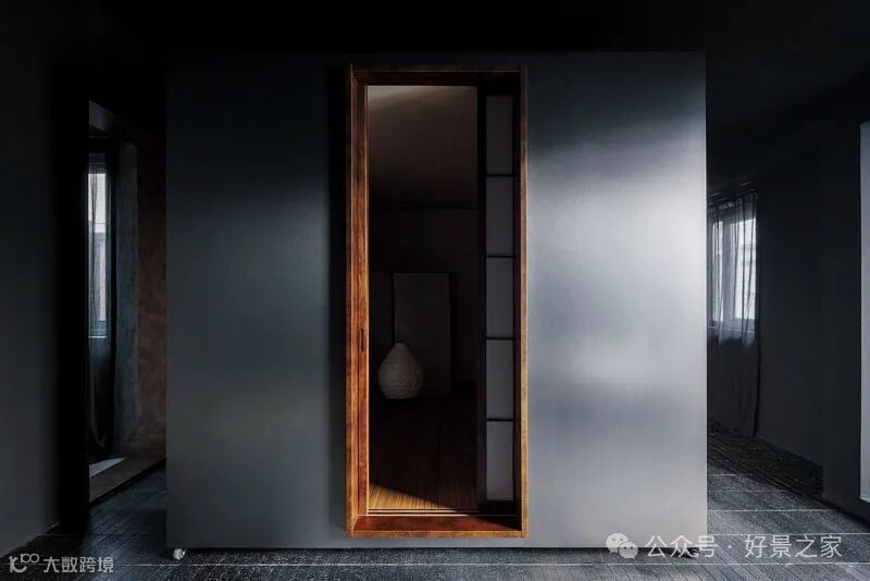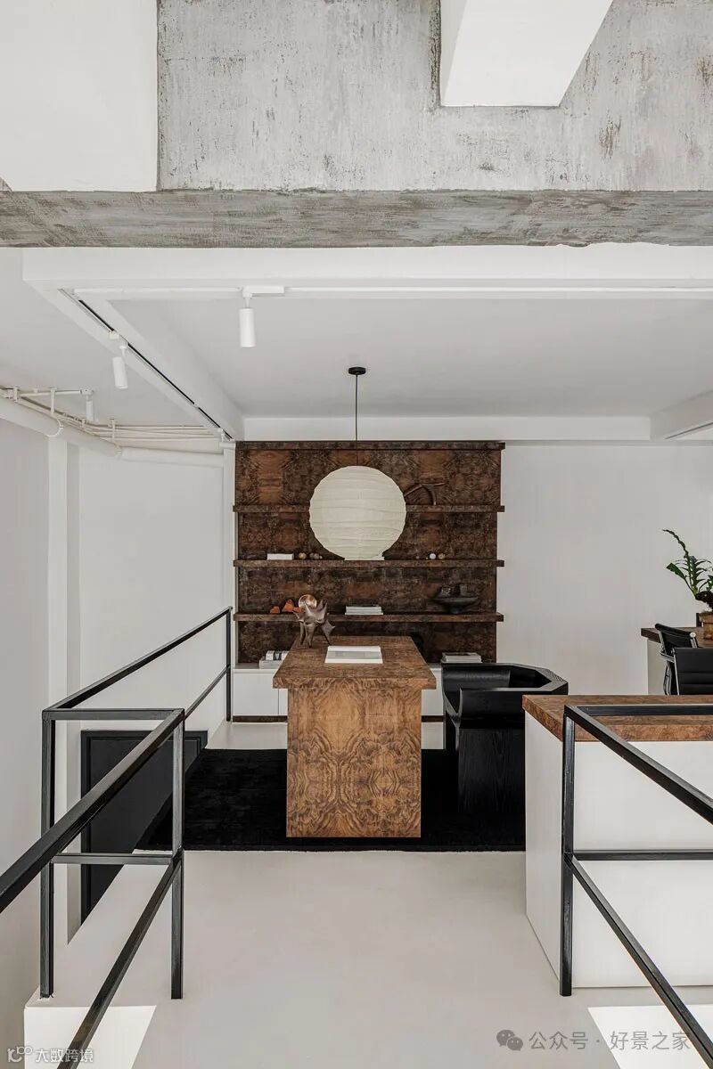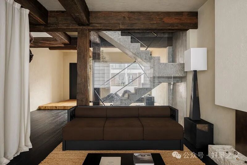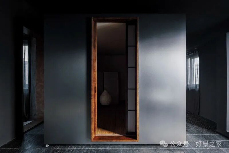 粗砺陶土墙、枯山水庭院、光影斑驳的极简暗黑和室,裸露的墙壁、穿透光影的纱帘、陈旧的手工砖,大胆将野生感的枯树装置贯穿两层垂钓在空间中心,每一帧都是电影级画面。