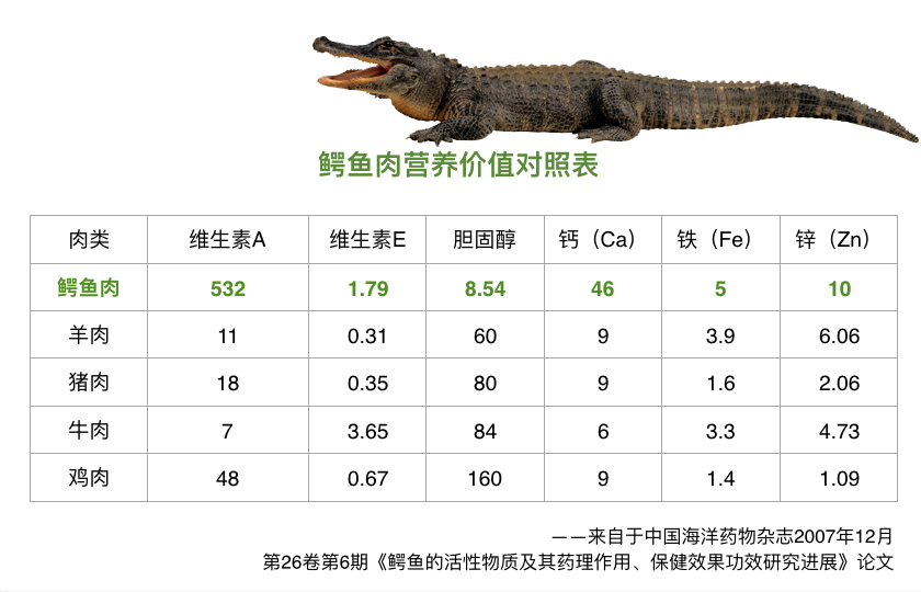 鳄鱼做为野外霸主,生物链最顶端、地球上存活最久的生物之一,食用会有种凌驾于食物链顶端的成就感。