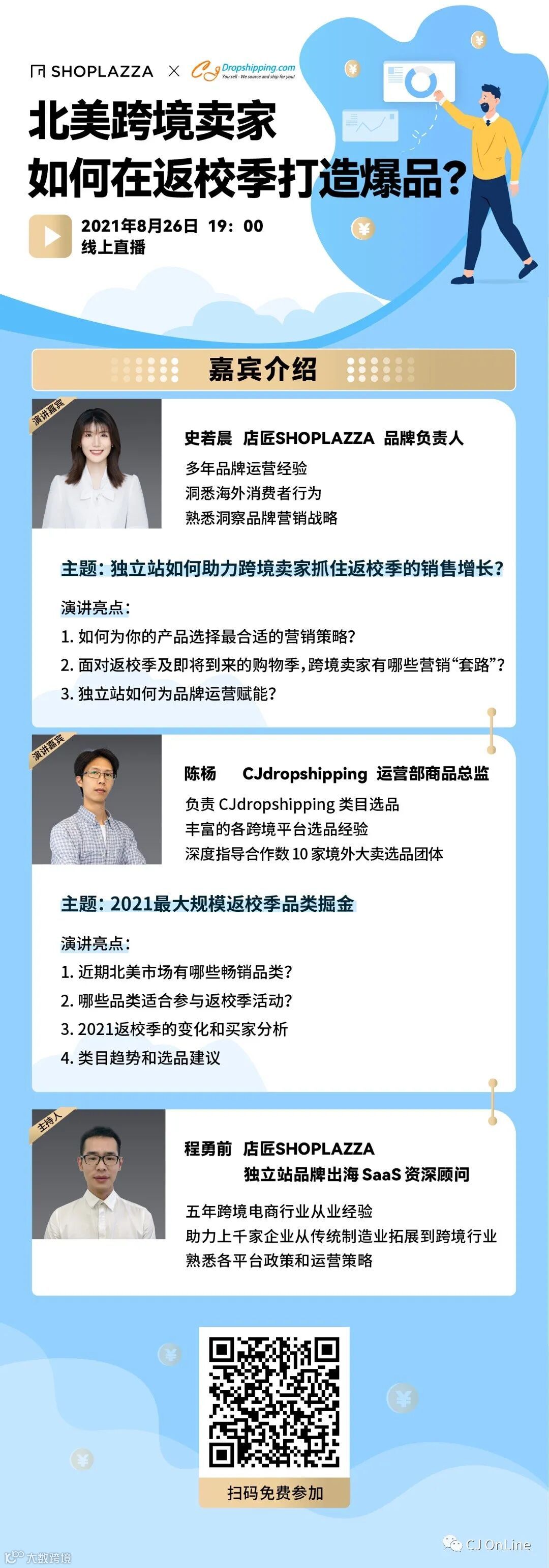 CJDropshipping×SHOPLAZZA(店匠)线上直播为北美跨境卖家提供返校季爆品打造思路。帮助独立站跨境卖家调整营销策略,提供选品方向,利用返校季完成销售增长。专家给予市场洞见,助你快人一步,返校季爆卖。