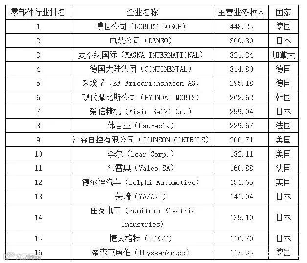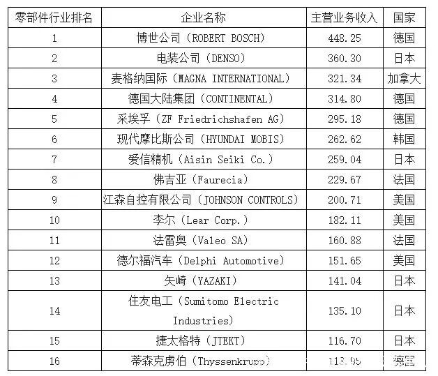 发达国家的汽车零部件行业经过长期发展,已具有规模大、技术力量雄厚、资本实力充足、产业集中度高、全球同步配套的特点;行业内已涌现出了一批以德国博世、大陆和美国江森自控、日本电装及爱信精机、法国佛吉亚和法雷奥等公司为代表的销售收入超百亿美元的世界知名零部件企业。这些国际知名的汽车零部件企业具有强大的经济实力和研发力量, 引领着世界汽车零部件行业的发展方向。
