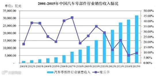 2001-2015年我国汽车零部件行业销售收入规模及增长情况