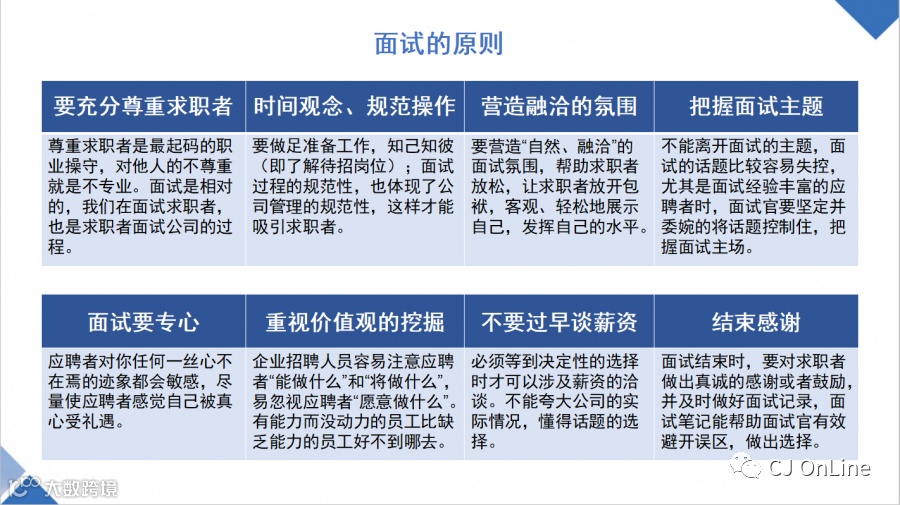 面试的过程及技巧。面试,既是在考察应聘者,也是在考验面试官。面试前:我们需了解招聘岗位职责和任职要求,并设计对应的问题。在发现简历上明显的异常点或者不太明确的地方,可针对这些疑问点提出面试问题。不要被应聘者简历忽悠了!面试中:可以先简短的介绍自己,建立比较融洽的气氛;问题需少而精,关键问题要深挖;面试时要学会倾听,同时学会识别虚假信息;面试官一定要把控主动权;面试结束后需要对应聘者表达出感谢,辛苦了之类的结束语。面试后:面试结束后,要及时对应聘者进行评估和决策。如果是多轮或者多人面试,要跟相关的面试官做好各项综合评估,再最终做出决定。