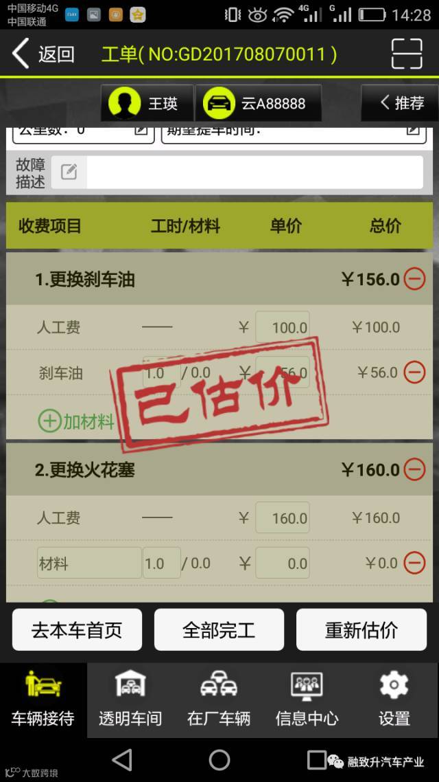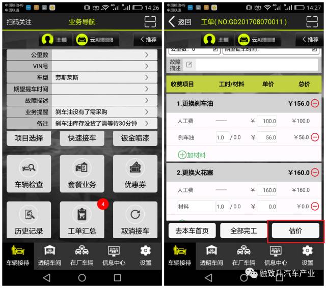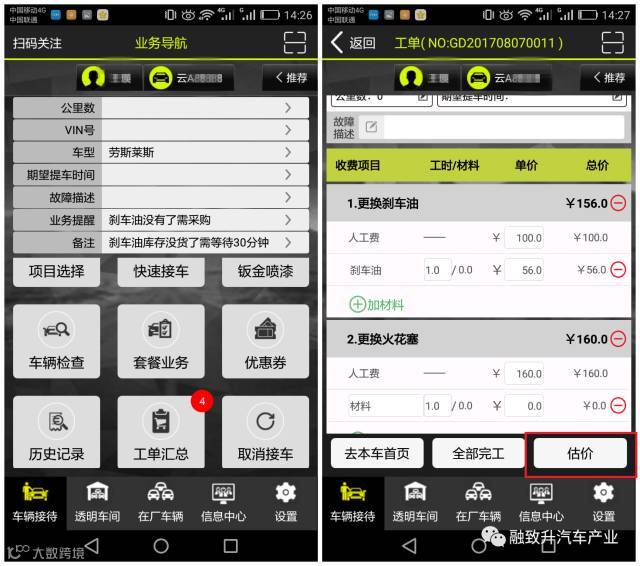 这时候开始计入工单业务的估价-配件商客户协助客户对车主需要维修的材料进行报价