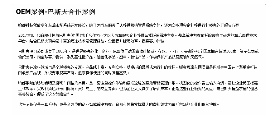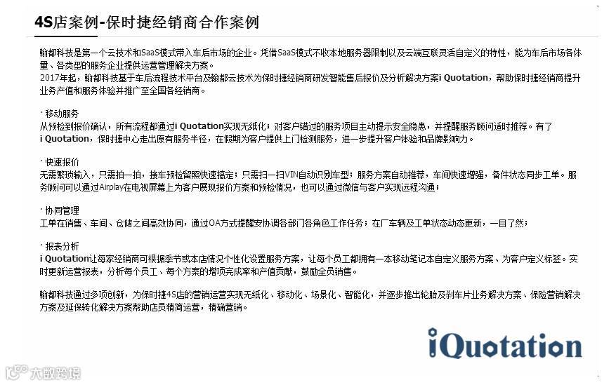 目前,使用车抓手翰都系统的用户遍布全国20多个省市,他们分别为普通汽修厂到大型汽修集团公司,配件商道大型配件生产商以及世界百强的国有车险企业。所有用户普遍对翰都研发的操作系统给予了高度的评价。这些用户因为翰都提供的优化解决方案纷纷摒弃了使用多年的传统软件,这样的喜新厌旧可谓是对翰都科技努力实现创新的最大认可。正式基于这样的认可及信任,再2015年开始整个风险投资大步走进冬天的时候,翰都科技却进一步获得春晓资本的青睐,获得千万级美元投资,进一步巩固了翰都科技再车后SAAS不可撼动的领先优势。与所有汽车后市场创新企业的区别是:不抓取门店的客户(这是所有客户都比较关注的问题);不干预门店的配件链条;不要求门店改头换面。只专注如何通过优化操作系统来服务门店实现互联网化服务能力,实现产业升级并提升盈利。