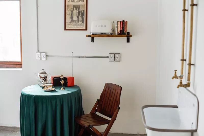 墨绿深红的色彩搭配,是曾经那个时代的审美烙印,墙头的轮滑吊灯,做旧的柜子,脱漆的椅子,此刻,仿佛穿越了时空隧道回到久远的年代,不愿醒来……