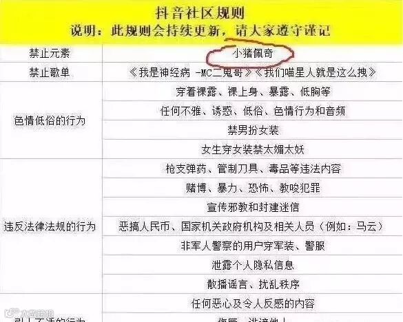 不过,去年4月,抖音公布了新的社区规定,公布了一系列被禁的内容,小猪佩奇赫然在列: