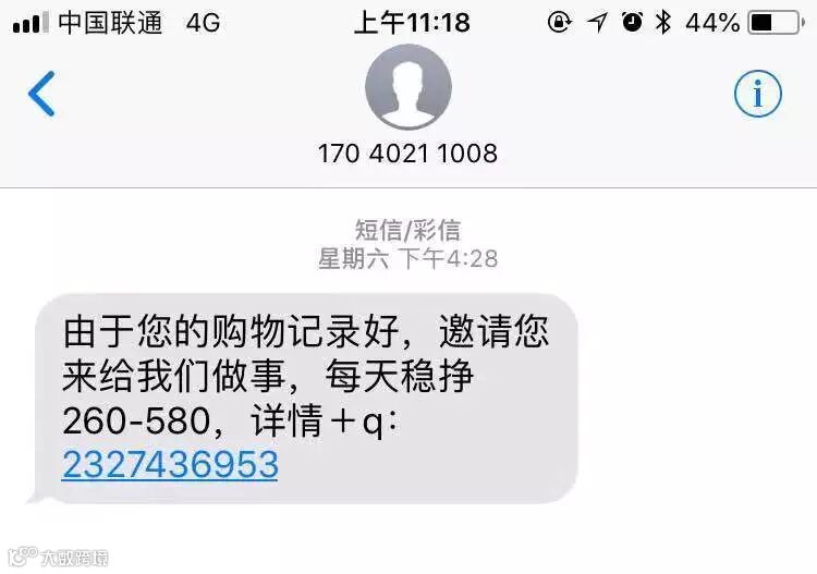 可能你在淘宝购买一件心仪的商品,没过几天就会收到一条短信“由于您的购物记录好,邀请您来给我们做事,每天稳挣260-580,详情+q:12345678”。