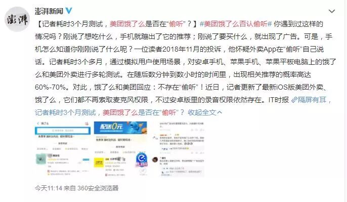 近日,记者耗时3个月测试,美团饿了么是否在“偷听”?
