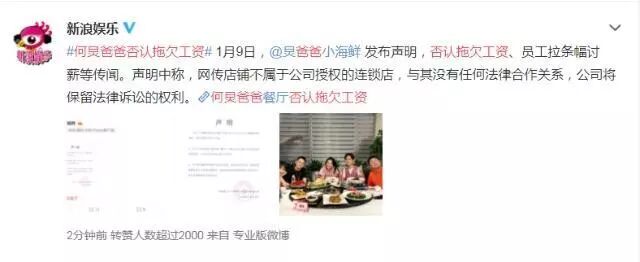 何炅爸爸公司“炅爸爸小海鲜”发声明否认“拖欠员工工资”传闻,称文章中所展示的店铺(图片)不属于本公司旗下任何授权的连锁店铺,与本公司无任何法律关系。