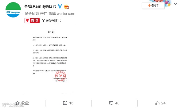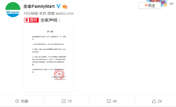 昨天14点27分全家通过微博发表声明称: