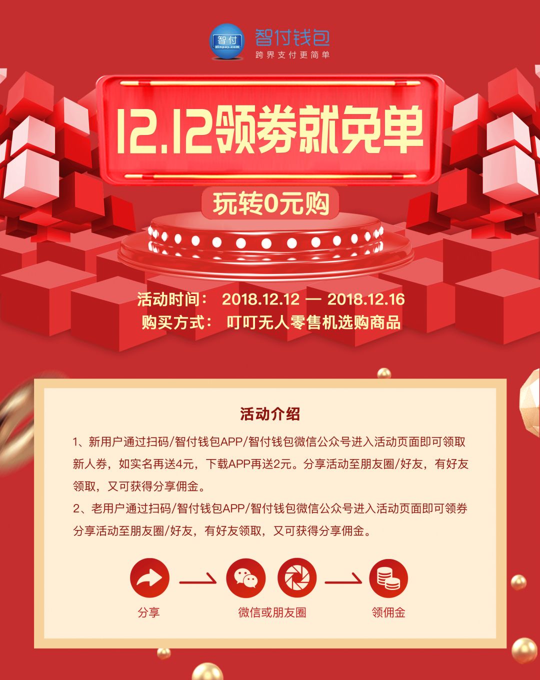它就是智付科技集团旗下的智付钱包和叮叮无人售货机联合推出“12.12领券就免单”活动,活动时间为2018年12月12日0:00-12月16日23:59,玩法也是非常简单。只需3步,就可以0元抢到好货!