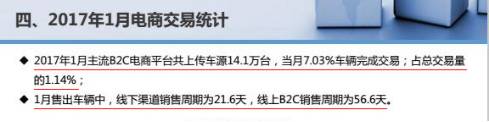 上述中国汽车流通协会的统计,让人联想到最近某篇文章谈到的,某三家电商平台在二手车行业呈现三局鼎立之势。从数据上看,电商的市场占有率恐怕只能算是二手车交易的冰山一角,而且服务周期线下渠道也比线上B2C快一倍还多,电商平台的作用略显鸡肋。