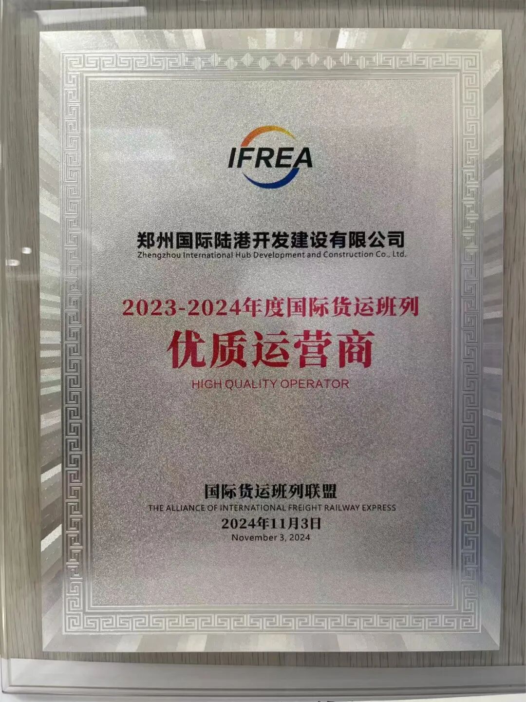 郑州陆港公司荣获“2023-2024年度国际货运班列优质运营商奖”