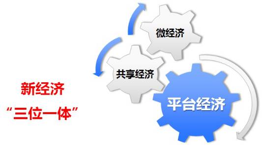 新经济是平台经济、共享经济和微经济三位一体的经济形态。平台经济即以平台为核心的经济形态;共享经济或称分享经济,比如滴滴打车;微经济是以海量个人和小微企业为经济主体的经济形态,比如淘宝的上千万个卖家,未来小微企业比重会越来越高。