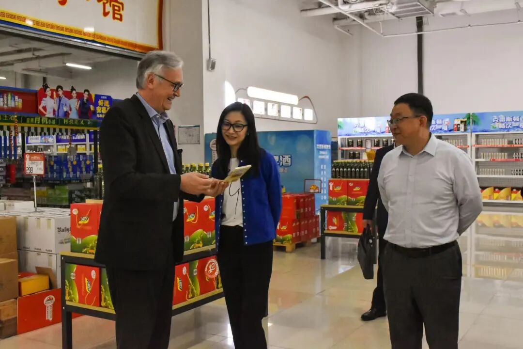 杨文俊对德迪业一行的到来表示欢迎,随后在郑欧进口商品展示体验中心,详细介绍了运贸一体化项目开展情况,以及贸易促进班列运输,运输带动发展贸易业务取得的成效。目前郑欧进口商品货源地覆盖波兰、德国、比利时、法国等16个一带一路沿线国家,商品种类涵盖乳品、酒类、休闲食品、冷冻肉类、冲调果饮等品类,单品累计超过1800个,推出了斯纳格、克雷斯顿、欧礼特、乐优瑞等多个自有进口商品品牌。看着琳琅满目的进口商品德迪业发出了由衷的感叹并为陆港公司自主打造“郑欧进口商品”品牌“点赞”。当看到了展架上来比利时原装进口的巧克力时非常开心和自豪,并表示这一款巧克力在比利时市场也是非常受消费者欢迎,它口感十分细腻,可可香气浓郁,苦度适中,受众广泛。