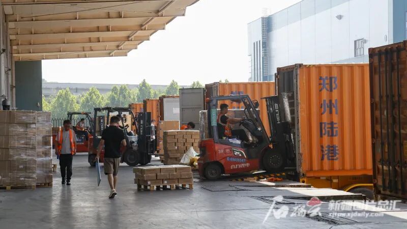 8月14日,郑州国际陆港开发建设有限公司的多式联运场站里,工人正在装卸货物。刘东莱摄