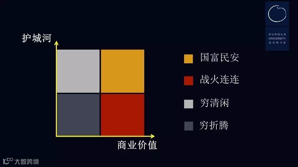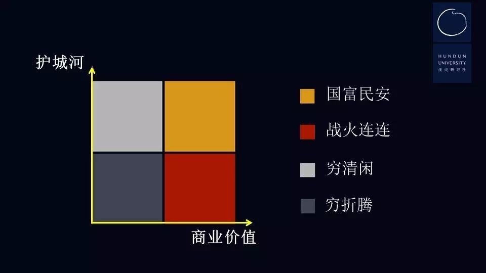 右下角红色的部分,战火连连,商业价值很高可以挣钱,但没有什么护城河,不断地有人涌入进来割麦子,一茬又一茬。比喻成地方就是华北地区,华北矿产丰富又是平原地带,往往就变成打仗时最容易拿下来的地方。