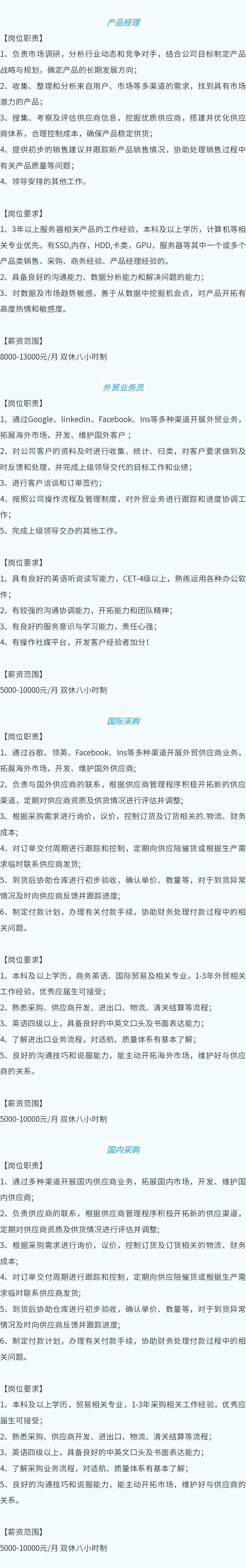 招聘岗位:产品经理、外贸业务员、国际采购、国内采购