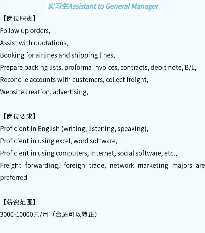 招聘岗位:实习生Assistant to General Manager
