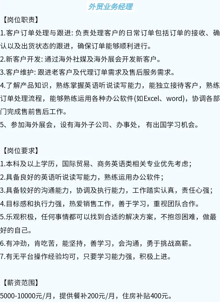 招聘岗位:外贸业务经理