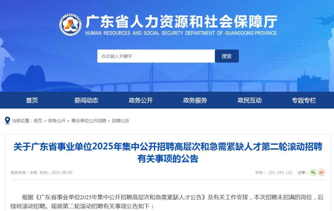 近日,广东省人力资源和社会保障厅发布《关于广东省事业单位2025年集中公开招聘高层次和急需紧缺人才第二轮滚动招聘有关事项的公告》(下称《公告》),全省各级事业单位招聘工作人员6465名。