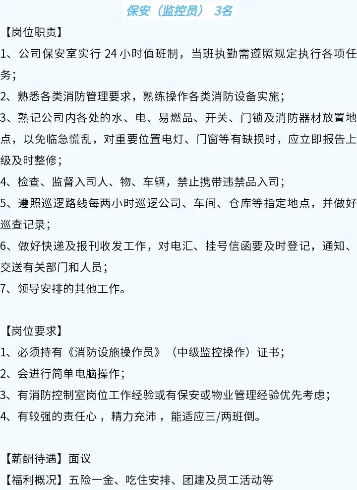 招聘岗位:保安(监控员)3名