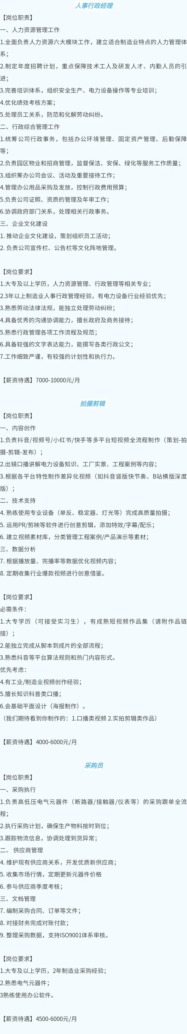 招聘岗位:人事行政经理、拍摄剪辑、采购员