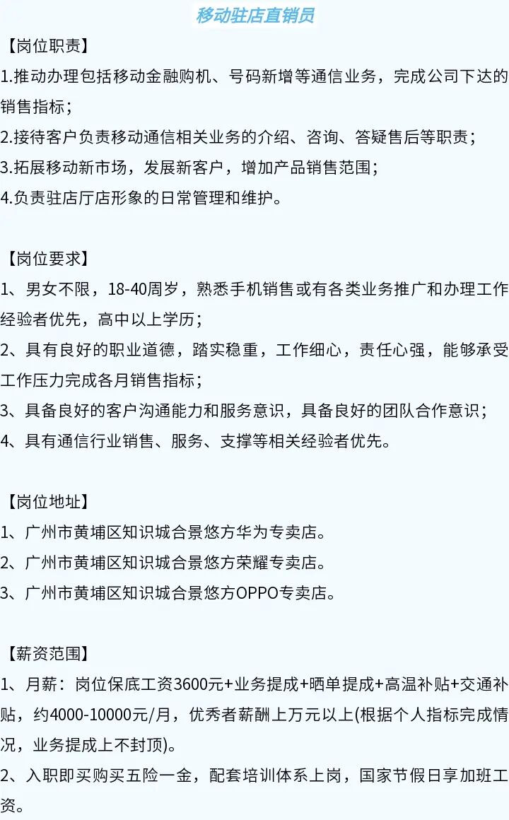 招聘岗位:移动驻点直销员