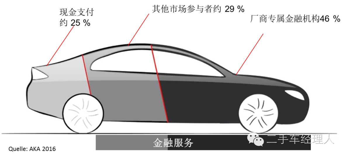 在德国,汽车金融渗透率很高,据德国联邦融资租赁企业协会(BDL)数据显示,私人和企业上牌车辆只有25%是现金方式购车,其余75%是通过融资租赁或汽车金融信贷的方式售出的。每年汽车信贷金额达到477亿欧元。这75%的金融信贷服务商中,通过厂商专属金融机构的为46%,其它市场参与者共占据约29%的市场份额。